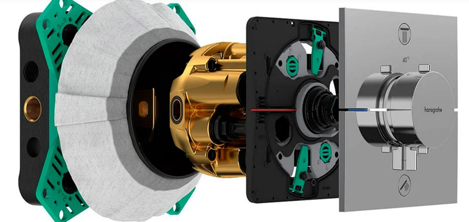 Vannaxonada yashirin o‘rnatish uchun hansgrohe ShowerSelect Comfort va DuoTurn kabi tashqi qismlarning jozibador assortimentini taklif etadi. Bu minimal boshqaruv elementlari bo‘lib, ular chiqib turgan termostat yoki aralashtirgich o‘rniga o‘rnatiladi, lekin har doim santexnikni jalb qilgan holda o‘rnatilgani ma’qul.